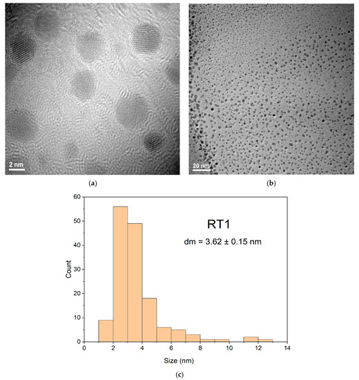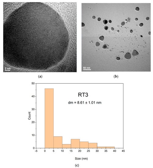 TEM images represented at different resolutions, for both samples coded RT1 and RT3, show different shapes of silver nanoparticles obtained. Comparing shapes of silver nanoparticles of samples RT1 and RT3 shown that a larger volume of the strong reducing agent (NaBH4) added at the sample RT1 could influence the kinetic reaction for nanoparticles formation led to obtaining oval or spheres shapes (Figure 6a,b) and it is noticed that no agglomeration tendency for the particles is observed. For sample encoded RT1 probably, the larger volume added of the strong reducing agent influence both the rapid Ag0 nuclei formation drives to obtaining of small nanoparticles (Figure 6b). Thus, for RT1 sample (Figure 6c) show mainly nanoparticles formation with sizes less than 4 nm with a bi-modal distribution (if considering the few particles larger than 10 nm) (Figure 6c).