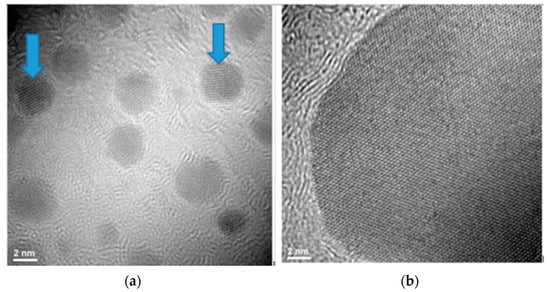 The sample HT4 (Figure 13b) indicate spheres particles formation with agglomeration tendency formed nanoparticles bigger size around 45 nm diameter, than HT1 (Figure 13c). The distribution of the AgNPs for samples HT1 and HT4 indicated by TEM images (Figure 12b and Figure 13b) are sustained also by obtained DLS results [] (Figure 10). The structure of nanoparticles for HT1 and HT4 samples indicate in TEM image (Figure 12a and Figure 13a) formation of multiply twinned planes developed on multiply direction comparing samples obtained by the room temperature method with twinned plans (Figure 8a,b).