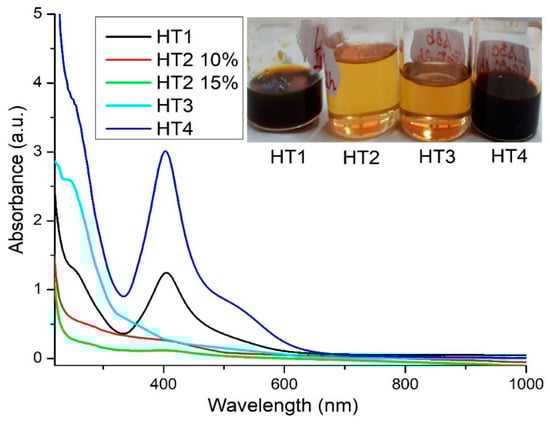 UV-VIS analysis was done with samples solution diluted at the concentration 10% or 15%. Due to the high viscosity and dark brown color of the obtained samples all solutions were diluted in order to allow the transmission of light. The resulting samples named HT (solvothermal synthesis at high temperature) have different colors from deep yellow color to dark brown depending on the temperature and time applied during the solvothermal synthesis.