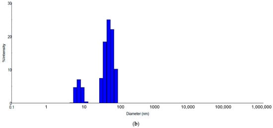 The DLS analysis is mainly used to determine the particle size and distribution in aqueous solutions. The size obtained through DLS analysis is usually larger than TEM analysis, which may be influenced by the agglomeration tendency at nanometric scale []. Particles size and surface charge are two main important parameters that can determine the targeting efficacy, deposition, rate of clearance and cellular uptake particles. Dynamic light scattering is the most commonly used method to determining the hydrodynamic diameter of the particles suspended in solution. Particles with zeta potential between −10 mV and 10 mV are considered neutral and prone to aggregation, while particles with 10 mV ≤ │ζ│ ≤ 30 mV are indicating that they can repel each other and assure an incipient agglomeration but, if the │ζ│ increase further, the stability increase considerable and minimal or no aggregation occurs []. By DLS, the polydispersity of the particles can be also evaluated. A polydispersity index as PI close to (1) indicates large variations in particle size, while values close to 0 value indicate that the particles are monodispersed [].