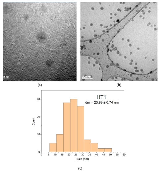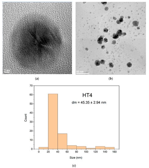 TEM images of samples obtained by the solvothermal method encoded with HT1 and HT4 at different resolutions showed some morphological differences in the obtained nanoparticles. The AgNPs sample coded HT1 treated at 200 °C (Figure 12) show a uniform spherical shapes formation. The morphology of sample coded HT1 (Figure 12a,b) indicate a relative uniform dispersity of sizes and predominant spheres shapes formation. The TEM for sample HT1 (Figure 12a) indicate at the scale of 2 nm the presence of multiply twinned plane. The histogram corresponding to the sample HT1 (Figure 12c) show a bimodal distribution of nanoparticles sizes with main diameter size around 24 nm value. Nanoparticles formed presents an agglomeration tendency proven by size of nanoparticles more than 50 nm (Figure 12c).