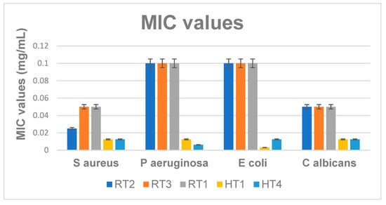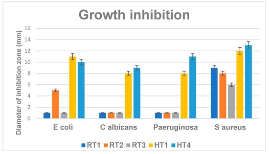 The antimicrobial activity of the developed NPs was extensively investigated by qualitative (growth inhibition diameter) and quantitative (MIC) experiments in both planktonic and biofilm cultures [,,,,,]. From the synthetized samples were selected for antimicrobial tests samples encoded RT and from solvothermal route HT1 and HT4 since they showed uniform nanostructured particles [,,]. The most significant antibacterial activity expressed for all of the evaluated strains was obtained for the samples coded with HT1 and HT4 obtained by solvothermal synthesis (Figure 14). The antimicrobial effect of the evaluated nanoparticles was obtained against both for the Gram positive species (S. aureus) and Gram negative (P. aeruginosa, E. coli) bacteria, but also against the opportunistic yeast C. albicans. HT1NPs and HT4NPs provided diameter higher diameter of inhibition zones, ranging 8–12 nm in all the test situations (Figure 14). Comparing these qualitative results among the two types of samples (RT and HT), the results suggest that HT NPs show enhanced antimicrobial effect, as compared to RT samples.
