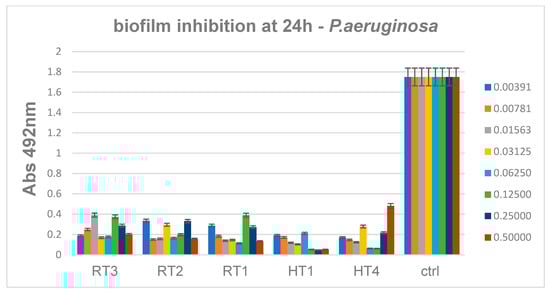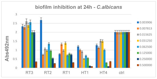 Antibiofilm data showed also that C. albicans monospecific biofilms are inhibited mainly by AgNPs obtained by solvothermal method at high concentration of AgNPs. The minimum biofilm inhibitory concentrations of samples encoded HT1-HT4 range 0.06–0.12 mg/mL, similar to the results obtained for Gram negative bacteria, while the biofilm inhibitory concentrations obtained for the RT1 sample are slightly higher ranging 0.12–0.25 mg/mL (Figure 19). For C. albicans results are relatively accepted for high concentration and for solvothermal samples.