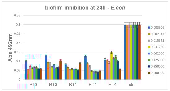 For the Gram-negative evaluated species, E. coli, results showed that biofilms are slightly more efficiently inhibited by the solvothermal nanoparticles encoded HT, as compared to the other samples (Figure 17). For these samples the minimum concentrations required for biofilm inhibition range 0.06–0.12 mg/mL, similar to P. aeruginosa biofilm inhibition results.
