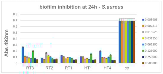 Inhibition of S. aureus biofilm development in the presence of the obtained AgNPs for 24 h, p < 0.001 when comparing Abs 492 nm values of RT and HT samples to control.