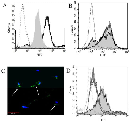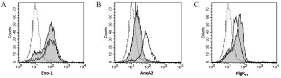 Three Plg-Rs are Detected on Mesothelial Cells; Plg-RKT Contributes to Plg Binding. Representative flow cytometric analyses showed significant expression of (A) ENO-1, (B) AnxA2, and (C) Plg-RKT on MeT5A (–––) and peritoneal mesothelial cell surfaces (grey shaded histogram). In all histograms, isotype control shows little binding (- - -).