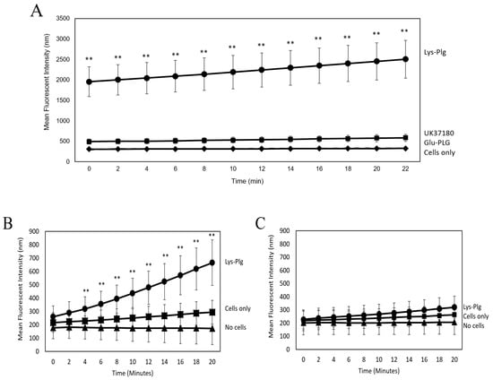 Cells were seeded at 1 × 105 cells per well on a 96-well plate and adhered overnight. Cells were serum-starved overnight and then incubated with 1 µM Glu- or Lys-Plg, as specified in figure legends; Plg concentration was determined experimentally after testing doses from 1–10 µM (data not shown), and the lowest dose was chosen to mimic normal serum Plg concentrations []. A plasmin activity assay was then run according to the manufacturer’s specification (Plasmin Activity Assay Kit, Abcam, Cambridge, UK). Briefly, after cell incubation with test samples for 1–12 h, as indicated in figure legends, 50 µL of plasmin substrate was added to each well. Substrate cleavage was measured by fluorescence detection at Ex/Em 360/450 nm in kinetic mode (read every 2.5 min for 22 min) on a Synergy HTX Multi-Mode Microplate Reader. To measure activity in the supernatant, experiments were set up as above, then supernatants collected and moved to clean assay wells following a 1 h incubation with Plg. Supernatants were replaced on cells with serum-free media. Pla substrate was then added to cells and supernatants separately, and activity assessed as above.