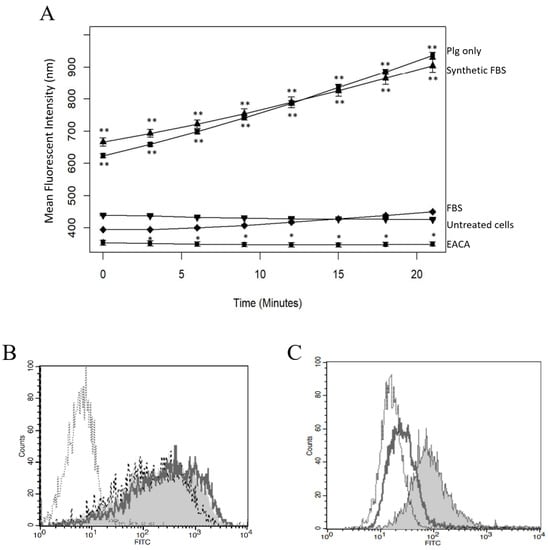 Since many PlgRs are broadly categorized by their ability to bind Plg using a lysine-binding domain (LBD), we examined the effect of the LBD on Plg–mesothelial cell interaction. The addition of a known LBD inhibitor, EACA (1.6 mM, final concentration), significantly decreased Pla activity below levels detected in untreated mesothelial cells (Figure 3A, p = 0.01). We also evaluated the effect of FBS on Plg activity. When FBS was added to serum-starved cells just prior to Plg addition, a significant reduction in Pla activity was noted (Figure 3A, p < 0.01). Interestingly, addition of synthetic FBS had no effect on Pla activity, suggesting that a component of animal FBS does indeed interfere with Plg activation on the cell surface (Figure 3A). We used flow cytometry to determine if FBS interferes with Plg binding and detected no difference in Plg when FBS was added just prior to Plg (Figure 3B). Addition of Fast-Gro synthetic FBS also had no effect on Plg binding. We further confirmed that EACA does reduce Plg binding compared to isotype control levels (Figure 3C). Together, these data indicate that animal-derived FBS reduces Plg conversion to Pla but does not affect Plg binding to cells, while EACA prevents Plg binding, thus resulting in decreased Pla activity.