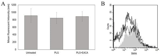 To measure differentiation, cells were seeded on a 96-well plate and treated with Plg, Plg and aPlg, or TGF-beta (2 ng/mL) for 48 or 96 h in FBS-free media. Treated cells were collected, washed twice with 1× Perm/Wash (BD Biosciences, San Jose, CA, USA), pelleted by centrifugation, then stained with primary antibody for 30 min. Cells were stained with either FITC-conjugated anti-SMA or unconjugated rat anti-vimentin, as previously described []. Cells were then washed twice with Perm/Wash and resuspended in FACS analysis buffer or incubated with anti-rat PE-conjugated anti-rat secondary antibody for 30 min, washed with FACS buffer, and resuspended in FACS analysis buffer. All samples were analyzed on a FACSCalibur Flow Cytometer (Becton Dickinson, San Jose, CA, USA).