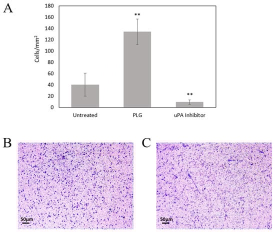 Plg Enhances MeT5A Invasion through a Collagen Matrix. (A) Lys-Plg increased Met5A invasion through a 2.65 mg/mL collagen matrix compared to untreated cells (n = 3). Addition of uPA inhibitor significantly reduced migration (n = 2), ** p < 0.001 by one-way ANOVA, mean ± SD. Representative images show cell movement through a collagen-coated Transwell membrane in the presence (B) or absence (C) of Plg. Cells attached to the lower membrane were fixed and visualized with crystal violet 24 h after seeding in the upper insert.