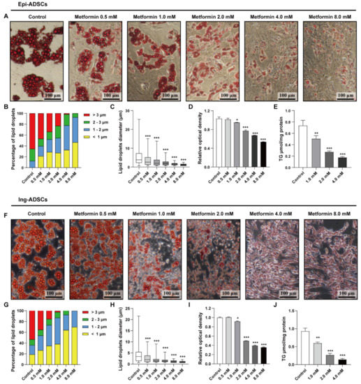 Lipid accumulation in the process of ADSCs differentiation after metformin treatments. (A) The images showing Oil Red O staining of differentiated adipocytes from Epi-ADSCs cultures with serial doses of metformin. (B–E) The diagrams showing the percentage of lipid droplets diameter (B), average lipid droplets diameter (C), relative optical density of isopropanol extraction (D), and triglyceride deposition (E) of differentiated adipocytes from Epi-ADSCs cultures with serial doses of metformin. (F) The images showing Oil Red O staining of differentiated adipocytes from Ing-ADSCs cultures with serial doses of metformin. (G–J) The diagrams showing the percentage of lipid droplets diameter (G), average lipid droplets diameter (H), relative optical density of isopropanol extraction (I), and triglyceride deposition (J) of differentiated adipocytes from Ing -ADSCs cultures with serial doses of metformin. Scale bars represent 100 μm for A and F. A one-factor ANOVA followed by a Tukey’s test was used to make group comparisons. * p < 0.05, ** p < 0.01, *** p < 0.001 versus control group. Epi-ADSCs, adipose-derived stem cells (ADSCs) from the epididymal fat pads; Ing-ADSCs, adipose-derived stem cells (ADSCs) from the inguinal fat pads; TG, triglyceride.