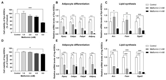Downregulation of adipogenic genes and lipogenic enzymes in ADSCs differentiation after metformin treatments. (A) CCK8 assay showing cell viability in Epi-ADSCs with metformin treatments. (B,C) Quantitative real-time PCR showing relative mRNA levels of adipogenic transcription factors (B) and lipogenic enzymes (C) in differentiated Epi-ADSCs with metformin treatments. (D) CCK8 assay showing cell viability in Ing-ADSCs with metformin treatments. (E,F) Quantitative real-time PCR showing relative mRNA levels of adipogenic transcription factors (E) and lipogenic enzymes (F) in differentiated Ing-ADSCs with metformin treatments. A one-factor ANOVA followed by a Tukey’s test was used to make group comparisons. * p < 0.05, ** p < 0.01, *** p < 0.001 versus control group. Acc, acetyl-CoA carboxylase; C/EBPα, CCAAT/enhancer-binding protein-α; Dgat2, diacylglycerol acyltransferase 2; Epi-ADSCs, adipose-derived stem cells (ADSCs) from the epididymal fat pads; Fabp4 fatty acid-binding protein 4; Fasn, fatty acid synthesis. Ing-ADSCs, adipose-derived stem cells (ADSCs) from the inguinal fat pads; LD, lipid droplets; Pparγ, peroxisome proliferator-activated receptor γ.