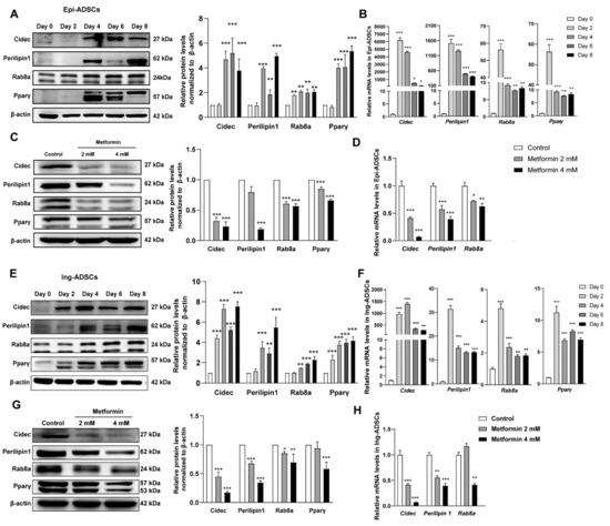 Based on the above data of lipid accumulation, diameter, and number of lipid droplets, we then focus on the possible underlying mechanism of inhibition effect of metformin on lipid droplets fusion and growth. Li Peng’s group has reported that lipid droplets fusion and growth are mediated by the cell death-inducing DFFA-like effector (CIDE) family proteins and two regulators [34,35,36,37,38,39,40]. Therefore, we firstly investigate the gene expression of Cidec, Perilipin1, and ras-related protein 8a (Rab8a) in the differentiation process of ADSCs. In differentiated Epi-ADSCs, the mRNA expression of Cidec and Periipin1 precedes its protein expression. The protein expression of Cidec was rapidly increased on day 4 and then maintained a higher level on days 6–8. The protein levels of Periipin1 were detected on days 4–8. The mRNA and protein levels of Rab8a were significantly increased in the differentiation process of Epi-ADSCs. The higher levels of Pparγ mRNA and protein were detected on days 2–8 and days 4–8 in differentiated Epi-ADSCs, respectively (Figure 4A,B). In differentiated Ing-ADSCs, the mRNA and protein expression of Cidec were rapidly increased at the earlier stage (days 2–4) and then maintained a higher level at the later stage (days 6–8). The protein levels of Perilipin1 and Rab8a were significantly increased on days 4–8. The mRNA levels of Perilipin1 and Rab8a were significantly increased on days 2–8. From day 2 to day 8, the expression of Pparγ mRNA and protein was detected and increased gradually in differentiated Ing-ADSCs (Figure 4E,F).