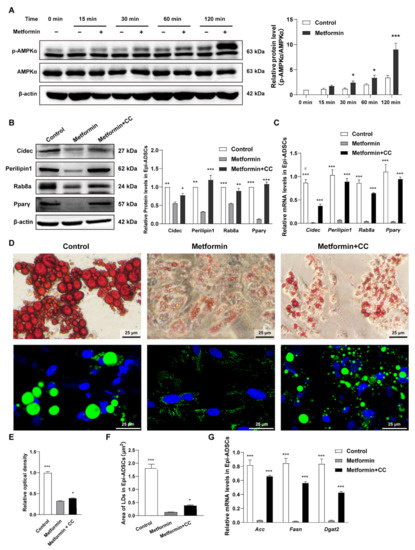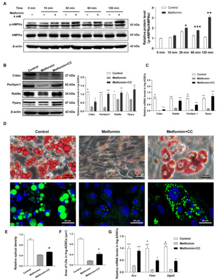 To investigate the mechanisms underlying inhibition of metformin on Cidec and its regulatory factors expression, we evaluated AMPK signaling in ADSCs. As shown in Figure 5A, the levels of AMPKα phosphorylation (p-AMPKα) presented a time course pattern in Epi-ADSCs with 4 mM metformin treatments. DMI alone resulted in a significant increase in the levels of p-AMPKα at 120 min. Additionally, p-AMPKα was further significantly increased by metformin treatments when compared with DMI alone (Figure 5A). A rescue experiment was performed to confirm the AMPK phosphorylation in the inhibition effect of metformin on Cidec, Perilipin1, and Rab8a expression. Compound C (a potent and selective AMPK inhibitor, CC) at 10 µM is used to inhibit AMPK phosphorylation induced by metformin [41]. The protein and mRNA levels of Cidec, Perilipin1, Rab8a, and Pparγ were increased in the metformin + CC group when compared with the metformin group (Figure 5B,C). The morphology of lipid droplets (Figure 5D), the relative optical density (Figure 5E), and average lipid droplet area per cell (Figure 5F) were significantly increased in the metformin + CC group relative to those in the metformin group. Consistent with these results, the mRNA expression of Acc, Fasn, and Dgat2 was also enhanced in the metformin + CC group when compared with the metformin group (Figure 5G). These data suggest that inhibition of AMPK signaling at least in part attenuates the decreased protein and mRNA levels of Cidec, Perilipin1, Rab8a, and Pparγ induced by metformin (Figure 5B–G). In addition, inhibition of AMPK signaling can also partially reverse the decreased levels of lipid droplets fusion, growth, and lipid storage induced by metformin. In differentiated Ing-ADSCs, metformin treatments can also activate the AMPK signaling and inhibit Cidec, Perilipin1, and Rab8a gene expression. Compound C can rescue metformin inhibition on Cidec and its regulatory factors expression. Consistently, Compound C also attenuates metformin inhibition on lipid droplets fusion and growth, and lipogenic enzyme expression (Figure 6A–G). These data indicate that activation of AMPK is involved in metformin inhibition on the fusion and growth of lipid droplets in the differentiation process of ADSCs.