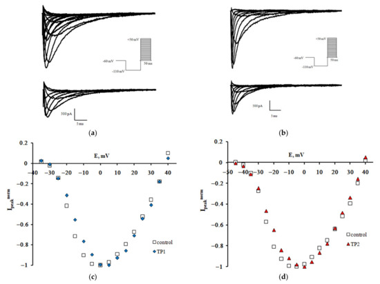 TP1 and TP2 effect on the NaV1.8 channel. Families of currents recorded before (top) and after (bottom) extracellular application of TP1 (a) and TP2 (b). Normalized peak current-voltage functions of the NaV1.8 channel in the control experiment and after application of TP1 (c) and TP2 (d). The holding potential of 500-ms duration was equal to −110 mV in all records. The leakage and capacitive currents were subtracted automatically. Voltage protocols are presented in the inserts.