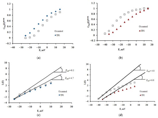 TP1 and TP2 modulate voltage sensitivity of the NaV1.8 channel activation gating device. Voltage dependence of the NaV1.8 channel chord conductance in the control experiment and after application of TP1 (a) and TP2 (b). The function GNa(E) was normalized, i.e., we plotted GNa(E)norm = GNa(E)/GNamax(E), where GNamax(E) is the maximal value of GNa(E). Zeff was evaluated from the tangents of the slopes of the asymptotes passing through the very first points of the L(E) function. Zeff decreased significantly after application of TP1 (c) and TP2 (d).
