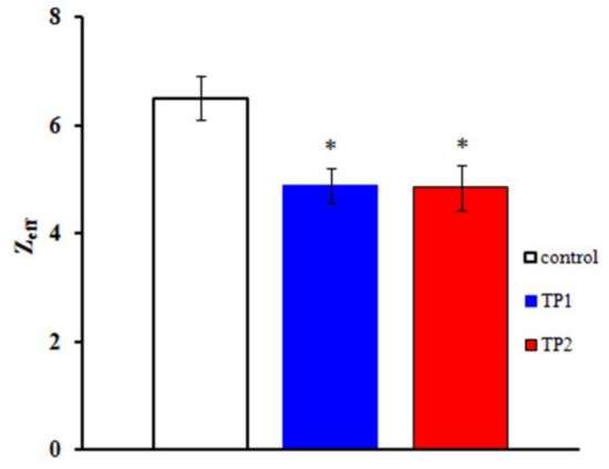 The Boltzmann distribution is regularly used to describe the GNa(E) function. The stationary characteristics of transitions between the states of the NaV1.8 channel activation gating device are assumed in this case to be determined by the voltage dependence of the chord conductance. To obtain the Zeff values herein, we have implemented a different approach, first suggested by the authors of the membrane ionic theory [] and later modified []. The protocol of Zeff evaluation is illustrated in Figure 2c,d. The tangents of the slopes of the asymptotes passing through the first three points of the L(E) function determine the limiting logarithmic sensitivity of the NaV1.8 channel to transmembrane potential change []. The Zeff value decreased from 6.1 electron charge units in the control experiment to 4.7 electron charge units after the application of TP1 (Figure 2c) and from 6.8 to 4.8 after the application of TP2 (Figure 2d). Data presented in Figure 3 clearly indicate a significant decrease in Zeff after the application of either tripeptide. Experimental data recorded on approximately 20 neurons in each case made it possible to obtain the averaged Zeff values in control experiments and after TP1 and TP2 application.