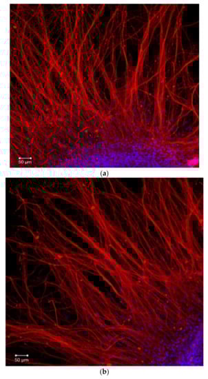Petri dishes containing the DRG explants were rinsed quickly once with phosphate-buffered saline (PBS), fixed using 4% paraformaldehyde for 3 min, washed 3 times with PBS, incubated with PBS containing 0.3% Triton-X for 15 min, washed 3 times with PBS, and blocked by PBS containing 10% FBS for 30 min. DRG explants were then incubated with anti-neurofilament 200 primary antibody overnight at 4 °C, washed 3 times with PBS, incubated with TRIC-conjugated secondary antibody for 2 h, washed again 3 times with PBS, incubated with DAPI for 15 min, washed once with PBS, and stored in PBS at 4 °C for imaging. All the incubations were carried out at room temperature.