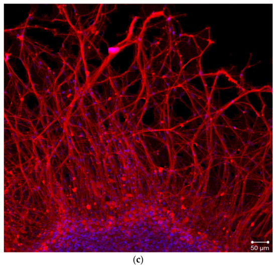 Fragments of DRG explant growth zone (third day of culturing). DRG explants were immunostained with anti-neurofilament 200 antibody (red). Nuclei were counterstained with DAPI (blue). Scale bar 50 μm. (a)—control, (b)—TP1 (100 nM), (c)—TP2 (100 nM).