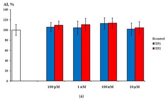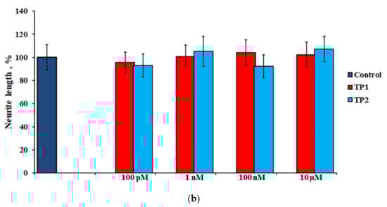 Effects of TP1 and TP2 on neurite growth in DRG explants. (a)—DRG area index values. The ordinate axis–area index (AI, %). Data are presented as mean ± SEM (n = 25 for each concentration; not significant, p > 0.5). (b)—DRG neurite length values. The ordinate axis–neurite length (%). Data are presented as mean ± SEM (n = 25 for each concentration; not significant, p > 0.6).