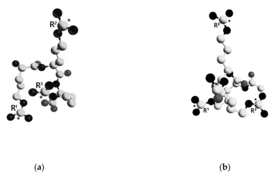 Spatial structure of the lowest energy conformations of TP1 and TP2. The dielectric constant ε = 10. Amino acid residues are numbered. Carbon atoms are presented as white spheres, oxygen atoms—gray, and nitrogen atoms—black. Carbon atoms of the guanidinium groups are marked with asterisks. Hydrogen atoms are not shown for clarity. (a)—TP1, (b)—TP2.