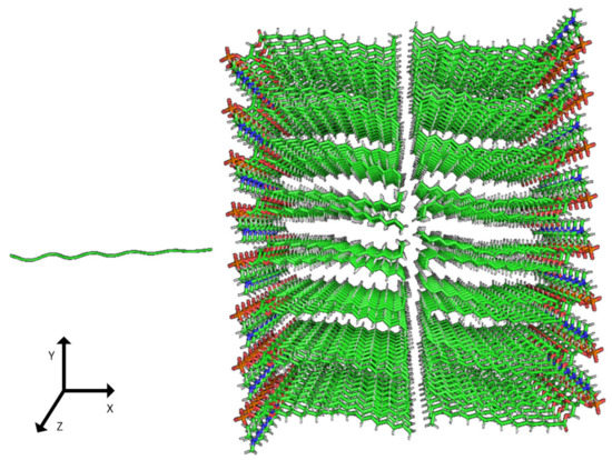 The method for preparing the membrane phospholipid bilayer is described in the Methods section. The construction of 8 copies of the phospholipid molecule (Figure 1) along the OY axis, and the construction of 8 copies of the resulting system along the OZ axis has been done in such a way that one layer includes 64 molecules (8 × 8) of phospholipids (Figure 2). After obtaining the bilayer, the studied peptide was added to it in an extended conformation (Figure 2). Then, the required amount of water was added to carry out calculations in periodic boundary conditions, with a parallelepiped as a calculation cell (Figure 3). Periodic boundary conditions were introduced in order to simulate an infinite layer of the membrane.