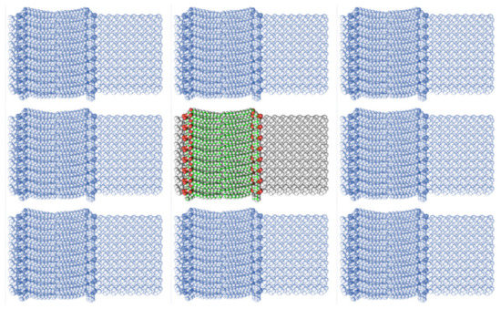 A system (colored) consisting of a phospholipid bilayer, water molecules, and a peptide inside water (not visible), as well as its images (monochrome) under periodic boundary conditions. The distance between the systems is introduced specifically for better understanding.