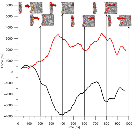 Typical force reaction of P2 peptide (red) and a membrane (black) when the peptide is pulled by the atom at a constant rate of 0.1 Å/ps. Snapshots of this process are presented at different time points: 0, 200, 400, 600, 800, and 1000 ps.