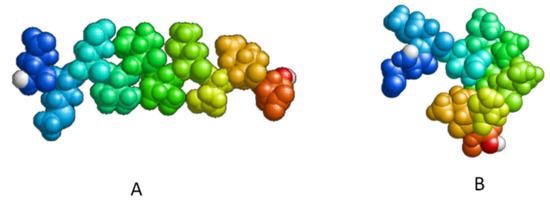 Compactization of P2 peptide (EMEVVVLNID) during relaxation: (A) the peptide after construction; (B) the peptide after relaxation in an aqueous environment after 1 ns.