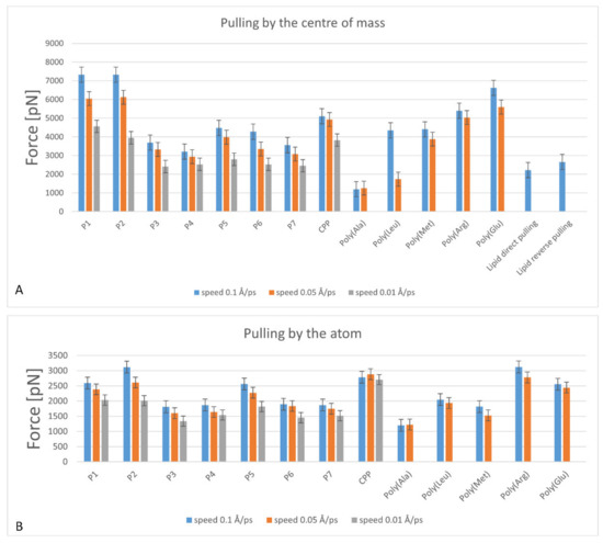 Maximum force statistics from all experiments of pulling peptides through the membrane: (A) by the center of mass, (B) by the terminal atom. Every column is an averaging of 8 implementations.