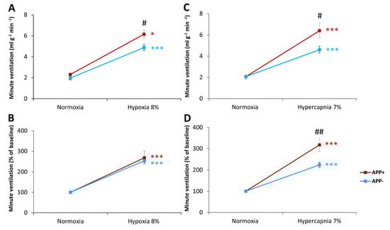 Minute ventilation (VE) during air breathing (normoxia) and ventilatory response to hypoxia and hypercapnia in APP+ (red line) and APP− mice (blue line) (A,B). Minute ventilation reactivity to hypoxia and hypercapnia expressed as a percentage of baseline (normoxia) values (B,D). Note the lack of difference in hypoxia reactivity in the two groups of mice (B) and significant increase in respiratory response and reactivity to hypercapnia in APP+ mice (C,D). The data are presented as mean ± SEM; * p < 0.05. *** p < 0.001 vs. normoxia value. # p < 0.05, ## p < 0.01 vs. APP− group (n = 6 for APP+ and APP−).