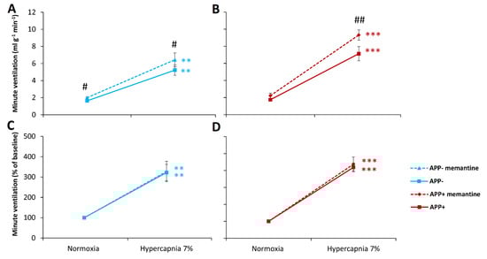 Minute ventilation (VE) during air breathing (normoxia) and ventilatory response to hypercapnia in APP+ (red line) and APP− mice (blue line) before (solid line) and after memantine injection (dashed line) (A,B). Minute ventilation expressed as a percentage of baseline (normoxia) values (C,D). Note the lack of difference in hypercapnia reactivity in the two groups of mice. The data are presented as mean ± SEM, ** p < 0.01, *** p < 0.001 vs. normoxia value, # p < 0.05. ## p < 0.01 vs. pre-memantine state (n = 6 for APP+ and APP−).