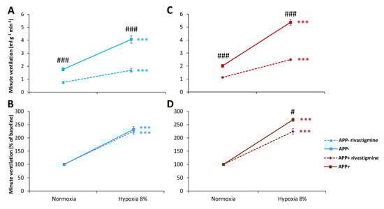 Minute ventilation (VE) during air breathing (normoxia) and ventilatory response to hypoxia in APP+ (red line) and APP− mice (blue line) before (solid line) and after rivastigmine injection (dashed line) (A,B). Minute ventilation expressed as a percentage of baseline (normoxia) values (C,D). Note the significant decline of reactivity to hypoxia evoked by rivastigmine only in APP+ mice. The data are presented as mean ± SEM; *** p < 0.001 vs. normoxia value. # p < 0.05, ### p < 0.001 vs. pre-rivastigmine state (n = 6 for APP+ and APP−).