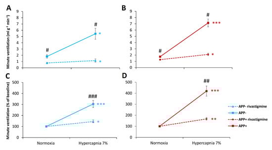 Minute ventilation (VE) during air breathing (normoxia) and ventilatory response to hypercapnia in APP+ (red line) and APP− mice (blue line) before (solid line) and after rivastigmine injection (dashed line) (A,B). Minute ventilation expressed as a percentage of baseline (normoxia) values (C,D). Note the significantly reduced hypercapnia reactivity in both groups of mice. The data are presented as mean ± SEM; * p < 0.05, ** p < 0.01, *** p < 0.001 vs. normoxia value. # p < 0.05, ## p < 0.01, ### p < 0.001 vs. pre-memantine state (n = 6 for APP+ and APP−).