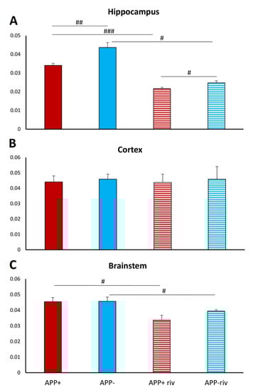 Acetylcholinesterase activity in the hippocampus, cortex, and brainstem was evaluated in both groups of rivastigmine-treated and untreated mice (1.5 mg/kg). The results showed changes in AChE activity in the hippocampus and brainstem (Figure 6A–C). APP+ mice had 22% less AChE activity in the hippocampus than healthy mice, and this activity was further reduced after rivastigmine administration in both groups (Figure 6A). After administration of rivastigmine, a 13% difference in enzyme activity was observed between APP− and APP+ mice, which was similar to the untreated condition (Figure 6A). Of interest are the results obtained in the brainstem analysis, where a reduction in AChE activity was observed after rivastigmine treatment in APP+ (26%) and APP− (14%) mice (Figure 6C).