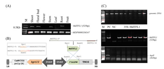 Total RNA was isolated from various tissues of ‘Fuji’ apple cultivars using the CTAB method []. First-strand cDNA was synthesized via reverse-transcription PCR (RT-PCR) according to the manufacturer’s instructions (PrimeScript™ 1st strand cDNA Synthesis Kit, Cat. #6110A, Takara, Kusatsu, Japan) using specific primers (Table S1). For cloning of genes into an expression vector, specific primers were designed for PCR amplification to contain KpnI and BamHI restriction enzyme sites at the 5′ end of forward and reverse primers, respectively. The PCR products were analyzed on 0.8% agarose gels, and the target band of these genes was recovered from gels and purified using a fragmented DNA purification kit (iNtRON MEGAquick-spin™ Plus, Seongnam, Korea). The fragment was then ligated into the pGEM®-T Easy vector (Cat. # A1360, Promega, Madison, WI, USA) and transformed into Escherichia coli DH5α competent cells (Cat. #9057, Takara, Kusatsu, Japan), and the plasmid DNA was then sequenced (Macrogen, Seoul, Korea). The sequence information of MdTFL1 (GenBank Accession No. AB052994.1) was obtained from the NCBI database. MdTFL1 was digested with BamHI and KpnI restriction enzymes, and they were then cloned into the binary vector pCAMBIA1300 (CAMBIA, Canberra, ACT, Australia), which was digested with the same restriction enzyme. The MdTFL1 gene was ligated into the binary vector in an antisense-oriented manner or revert direction (antisense) to produce the recombinant expression vector 35S::MdTFL1. The resulting construct was introduced into Agrobacterium tumefaciens EHA105 using the freeze–thaw method. After transformation, A. tumefaciens EHA105 was spread on the LB agar medium containing 50 μg/mL kanamycin and 100 μg/mL rifampicin, and it was cultured in the dark at 28 °C for 2 days. The transformed A. tumefaciens EHA105 colonies were picked, inoculated in 5 mL liquid LB medium containing antibiotics, and grown at 28 °C with shaking at 200 rpm in the dark overnight. The plasmid DNA of transformed A. tumefaciens EHA105 was isolated and analyzed for the presence of target genes in the expression vector via enzymatic digestion (Figure S2).
