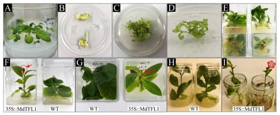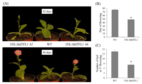 Leaf disks of in vitro tobacco plants were transformed with 35S::MdTFL1 using an Agrobacterium-mediated transformation method []. Briefly, leaf disks were cut to a size of 0.5 cm2 and they were soaked with the transformed Agrobacterium in a liquid co-cultivation medium MSCO (4.3 g/L MS medium including B5 vitamins, 30 g/L sucrose, 1 mg/L BAP, 0.1 mg/L NAA) plus 100 µM acetosyringone. Following Agrobacterium-mediated transformation, leaf disks were placed upside-down (adaxial contacted to medium) on solid MSCO medium containing 4 g/L gelrite in the dark for 3 days. The explants were washed with sterile distilled water 3–4 times to remove excess Agrobacterium, and the final washing was performed with sterile distilled water + 500 mg/L cefotaxime for 10 min with gentle shaking. The explants were blotted onto sterile filter 3M paper before transferring to the selection medium MSSE (MSCO + 250 mg/L cefotaxime, 100 mg/L hygromycin B), and they were cultured at 25 °C for 2~3 weeks in the dark for callus induction until adventitious shoots appeared and were then exposed to light for 1 more week. The putative transgenic shoots were cut at the base from the callus, transferred to MSSE, and cultured with a 16 h/8 h (light/dark) photoperiod and light intensity 100 μmol∙m−2∙s−1 subculture every 3 weeks. For obtaining whole plantlets, the shoots were transferred to the rooting medium MSR (4.3 g/L MS medium including B5 vitamins, 30 g/L sucrose, 0.1 mg/L IBA, 250 mg/L cefotaxime, 100 mg/L hygromycin B, and 4 g/L gelrite). The leaves of putative seedlings were cut off for genomic DNA extraction and PCR. The homozygous transgenic lines carrying 35S::MdTFL1 were transplanted to the soil for phenotypic and gene expression analysis. Plants were grown in a glasshouse at 25 °C under long-day conditions.