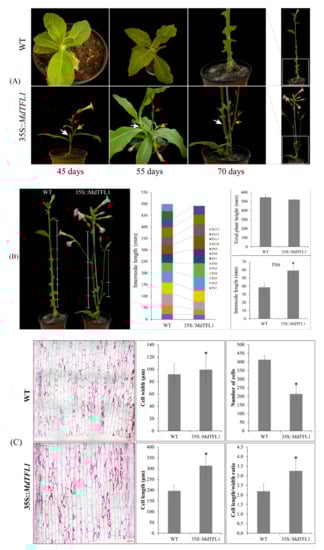 The MdTFL1 gene was originally known as a gene involved in delayed flowering with a prolonged vegetative phase. Therefore, suppressing its antisense expression has been implemented as a technique to control early flowering in apples [] and Arabidopsis []. In addition to an early flowering phenotype, we found that transgenic tobacco with antisense expression of MdTFL1 exhibited a wide range of multifactorial phenotypes, suggesting that MdFTL1 might play a multifaceted role in plant development (Figure 3A, Figure 4A, and Figure S4), similar to that reported in a previous study on transgenic tobacco overexpressing GhFT1 []. In our study, the axillary buds further developed into lateral shoots containing inflorescence flowers; however, this was not observed in transgenic tobacco overexpressing GhFT1 []. Taken together, our results suggested that the antisense expression of MdTFL1 not only caused lateral shoot outgrowth but also altered plant architecture by affecting the internode length through cell elongation.
