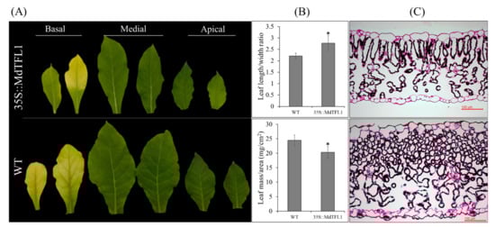 Second, we observed that transgenic lines exhibited a broad change in leaf morphology. All obtained transgenic lines exhibited an oblanceolate shape of apical, medial, and basal leaves and ovate shape of WT leaf. Moreover, the leaves of transgenic plants were smaller and thinner with lesser cell layers and lower LMA values than WT plants (Figure 5). Transgenic plants expressing FT show reduced leaf sizes in Arabidopsis and Cymbidium [,]. In another study, the leaves of transgenic tobacco overexpressed the GhTF1 gene with a smaller size but higher LMA value than those of WT. However, the leaves of all 35S::GhFT1 transgenic lines do not exhibit a uniform shape [].