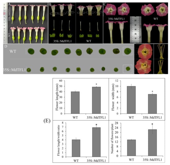 The shape of the floral organ in transgenic lines was longer in length and smaller in width as compared to that of WT (Figure 6C). For a detailed comparison, we measured the size of flower tubo and compared the length to width (L/W) ratio (Figure 6E and Figure S5). The average lengths of tubo in transgenic and WT lines were 48.62 ± 1.08 and 40.03 ± 1.41, respectively, and the average widths of tubo were 7.08 ± 0.43 and 9.98 ± 0.74 for transgenic and WT lines, respectively. Furthermore, the L/W ratio of transgenic lines was 1.72 times higher than that of WT, indicating the potential role of MdTFL1 in flower development. Additionally, transgenic lines showed a higher number of flowers than WT lines (Figure 6E). The numbers of flowers per plant were 13.8 ± 1.5 and 22.5 ± 3.6 for WT and transgenic lines, respectively. This might also affect the formation of fruits and their yield.