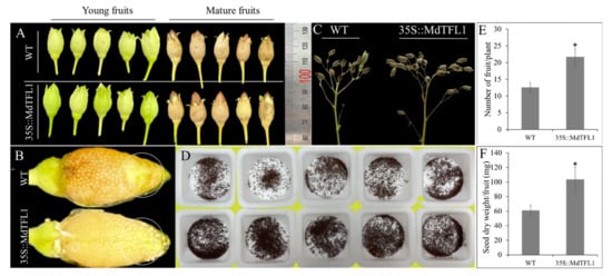 In addition to the changed phenotypes through antisense expression of MdTFL1 mentioned above, the differential development of fruit, another reproductive organ related to yield production, was compared in both lines. There was no difference in the fruit shape and size during developmental and mature stages between transgenic and WT lines (Figure 7A). However, the fruit of transgenic lines had more seeds than that of WT (Figure 7B–D). Similar to the comparison of flower development, transgenic lines had a higher number of fruits (21.7 ± 2.6) as compared to WT lines (12.6 ± 1.4) (Figure 7E). Consistently, the weight of fruit seeds in transgenic lines was much higher than that in WT, with increased seed dry weight values of 103.6 ± 16.9 mg and 61.0 ± 7.3 for transgenic and WT lines, respectively (Figure 7F).