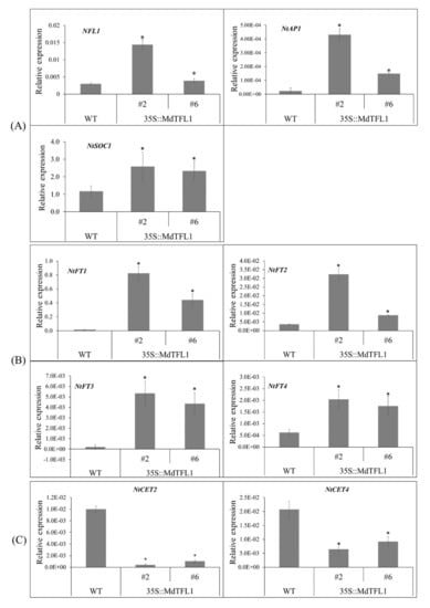 The flowering time in plants is inherently regulated by the floral regulator FT/TFL1 family genes. FT gene acts as a floral inducer in charge of transition from the vegetative to productive phase, whereas TFL1 gene functions as a floral inhibitor and maintains the juvenile phase. The MdTFL1 gene has the same function in apples and Arabidopsis []. Additionally, antisense expression of MdTFL1 RNA accelerates flowering in transgenic apple []. These observations suggested that antisense expression of MdTFL1 can promote flowering as a potential floral gene in tobacco. As expected, we found that the antisense expression of MdTFL1 promoted early flowering in transgenic tobacco. To further investigate the function of MdTFL1 in regulation of flowering, we evaluated the expression of endogenous floral genes. The expression levels of floral inducers NFL1, NtAP1, NtSOC1, and NtFTs were upregulated in transgenic lines (Figure 8A,B), and the expression level of CEN genes was downregulated in transgenic lines (Figure 8C).