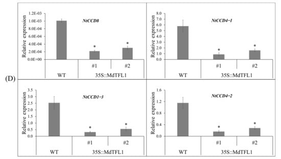 Many transduction signals, including floral inducers and inhibitors, are involved in flowering. 35S::MdTFL1-antisense triggered the expression level of genes involved in the metabolic pathways for flowering, including floral integrators. The transition from vegetative to reproductive phase regulates floral integrators such as NFL1, AP1, SOC1, FT, and CEN. qRT-PCR analysis showed that the relative expression level of NFL1, NtAP1, and NtSOC1 genes in transgenic lines was higher than that in WT (Figure 8A). Moreover, the expression of NtFT genes was upregulated (Figure 8B) and that of CEN genes (NtCET2 and NtCET4) was downregulated in transgenic lines (Figure 8C). For branching-related genes, we analyzed CCD genes involved in the biosynthesis of strigolactones (SLs), of which phytohormone regulates branching and affects plant architecture [,]. The expression levels of CCD genes, including NtCCD8, NtCCD1-3, NtCCD4-1, and NtCCD4-2, were all downregulated in transgenic lines (Figure 8D), consistent with the observation of lateral shoot branching phenotype in MdTFL1 antisense-expressing lines (described in Section 2.3).
