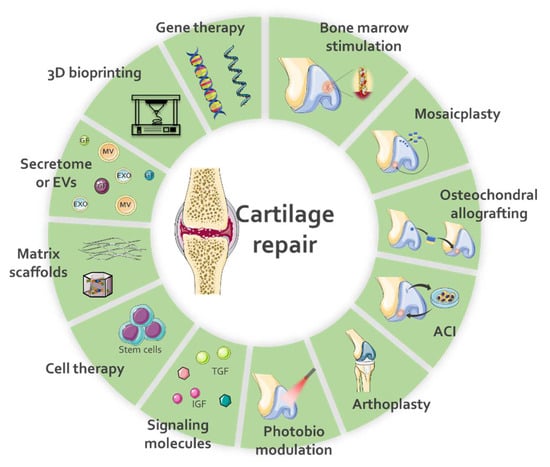 - Medvedeva, E.V.; Grebenik, E.A.; Gornostaeva, S.N.; Telpuhov, V.I.; Lychagin, A.V.; Timashev, P.S.; Chagin, A.S. Repair of Damaged Articular Cartilage: Current Approaches and Future Directions. Int. J. Mol. Sci. 2018, 19, 2366. [Google Scholar] [CrossRef] [PubMed]