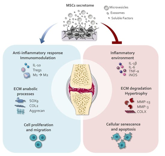 - Mancuso, P.; Raman, S.; Glynn, A.; Barry, F.; Murphy, J.M. Mesenchymal Stem Cell Therapy for Osteoarthritis: The Critical Role of the Cell Secretome. Front. Bioeng. Biotechnol. 2019, 7, 9. [Google Scholar] [CrossRef] [PubMed]