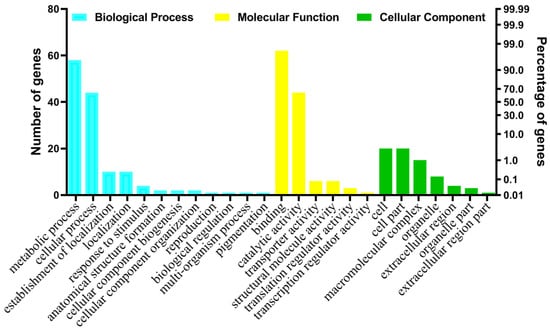 Functional classification of S. avenae-induced ESTs in tetraploid wheat seedlings identified from suppression subtractive hybridization library (SSH). Classification of ESTs based on biological process, cellular components and molecular function using Blast2GO software (http://blast2go.org) (accessed on 26 August 2021).
