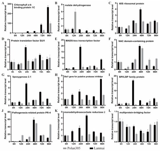 Expression profiles of 12 representative ESTs in seedlings of the resistant (Lanmai) and susceptible (Polan305) varieties under S. avenae infestation at different time points. RT-qPCR was used to detect the expression levels of the candidate genes. TaActin was used as an internal control. Each value represents the mean ± SE of three biological replicates. chlorophyll a-b binding protein (A), malate dehydrogenase (B), 60S ribosomal protein (C), SUI1-like protein (D), MADS-box tran-scription factor (E), NAC domain-containing protein (F), lipoxygenase 2.1 (G), Bsi1 gene for puta-tive protease inhibitor (H), BPI/LBP family protein (I), Pathogenesis-related protein PR-4 (J), monodehydroascorbate reductase 2 (K), multiprotein-bridging factor (L).
