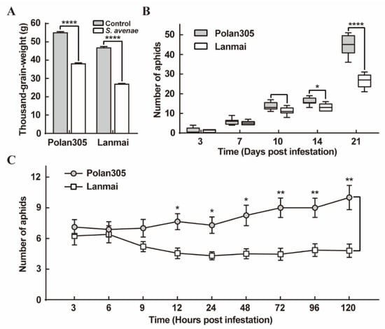 Wheat plants were seriously infested by numerous aphids, the thousand-grain weight of both Lanmai and Polan305 was significantly lower than those of the control and the reduction ratio of thousand-grain weight of wheat was 42.16% and 30.71%, respectively (p < 0.0001; Figure 4A).