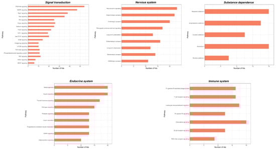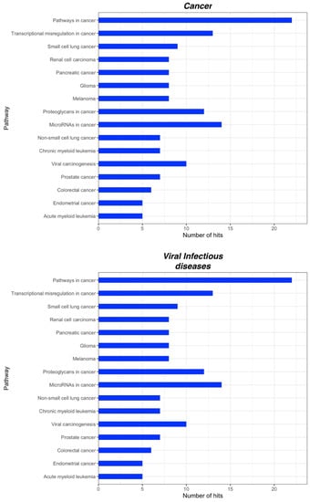 In another study [], six circulating miRNAs were significantly and differentially regulated in patients with FM compared to healthy controls. To identify putative gene targets of the deregulated miRNAs, a bioinformatic analysis was conducted, showing that several biological processes related to brain function/development and muscular functions were targeted by the dysregulated miRNAs in FM patients.