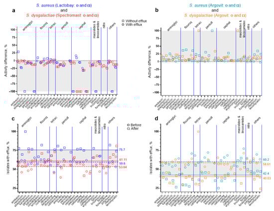 Percentage difference between the susceptibility (susceptibility value after treatment minus susceptibility value before treatment) of S. dysgalactiae to 31 antibiotics. Treatments: a—with Spectromast LC and b—with Argovit-C; circles—isolates with efflux effect and red squares—without efflux effect. Percentage of isolates with efflux effect for treatment with Spectromast (c) and Argovit-C (d): circles—before treatment and red squares—after treatment.
